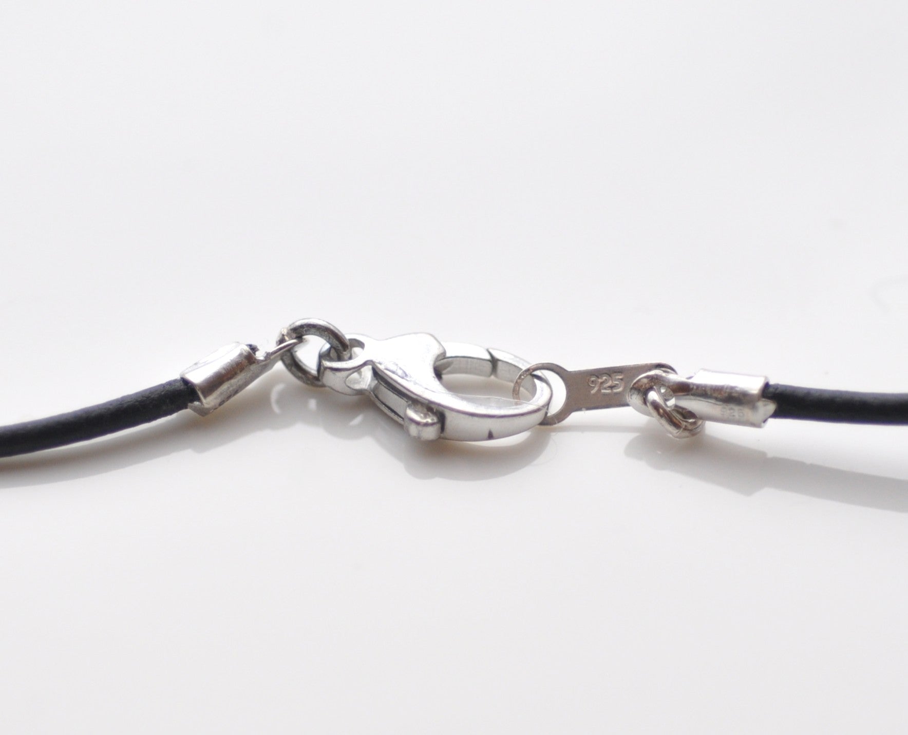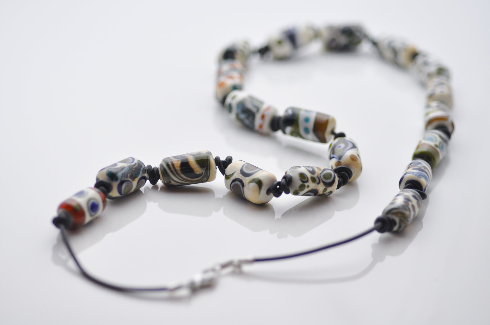 This piece features 19 barrel-shaped beads in olive greens, browns, and dark blues layered over an ivory background, the colours drawing inspiration from a William Morris design in matching hues. Each bead displays a distinct pattern, strung on a 2mm black Greek leather cord, finished with a sterling silver clasp and cord ends. Because each bead is handmade, their sizes vary slightly, giving each one its own quirky personality.