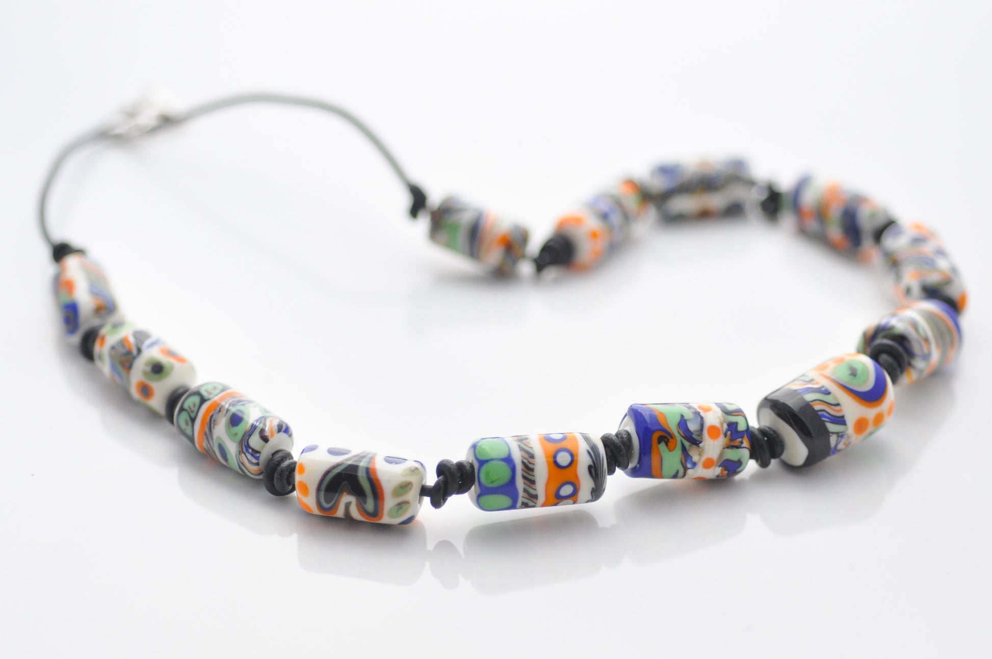 This design showcases 13 barrel-shaped beads in shades of orange, blue, green, and black, set against an ivory backdrop. Each bead is uniquely patterned and threaded onto a 2mm black Greek leather cord, elegantly secured with sterling silver clasp and cord tips. Because each bead is handmade, their sizes vary slightly, giving each one its own quirky personality.